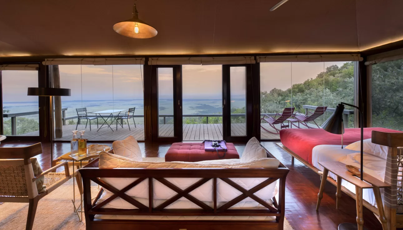 These spacious 100 sqm Tented Suites has floor-to-ceiling glass spanning all along the front to make the most of the dramatic views of the Maasai Mara from every angle – from the bed, the bath, the sitting area, the shower and even the w/c.