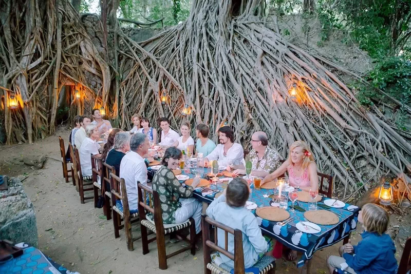 A table may be set within the age-old ruins, the crumbling walls clasped by fig tree roots like giant fingers in the flickering candlelight, on the jetty, next to the murmuring ocean, or under the magnificent Tamarind tree, on the beach, or on a surprise spot in the gardens.
