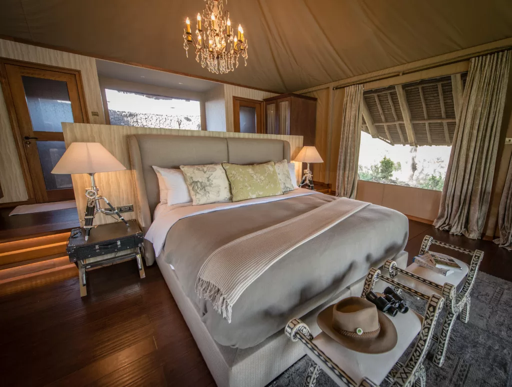 The tents’ open-plan design invites the cool breeze that drifts over the nearby natural springs, bringing the sounds and scents of the bush directly to you. The tent roofs’ made from sustainably sourced makuti palm leaves, which provide shade and have a natural cooling effect.