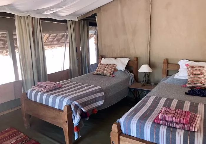 With 4 permanent tents and can accommodate up to 8 guests’ in 4 twins. All tents have an adjoining but enclosed outside bathroom. It is recommended children over the age of 5 years are allowed but must be supervised. A well equipped Kitchen with a proficient cook, a fridge and freezer.
