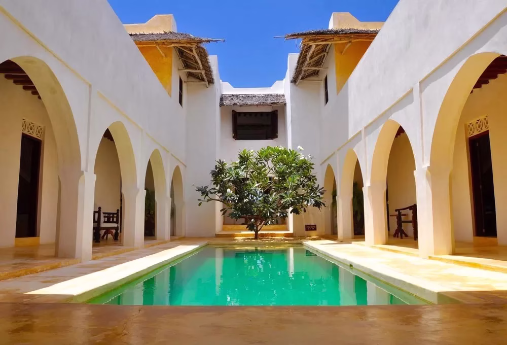 From the first floor makuti-covered veranda you can watch the dhows come and go, collecting sand and delivering fish. The house is designed along traditional lines around an inner courtyard, which holds a very private swimming pool, cooling the public rooms and bedrooms.