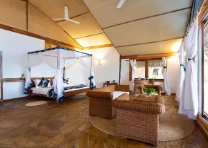 Seven Bungalow Suites, overlooking Chole Bay in twins and doubles tastefully furnished with carved and antique pieces, furnished with a Zanzibari bed, chairs, table, and an armchair.