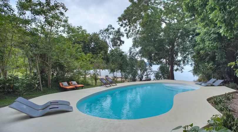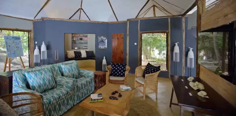 - The eight waterfront, thatched-roofed cottages (including one larger family cottage) were hand-built using traditional methods and local materials.