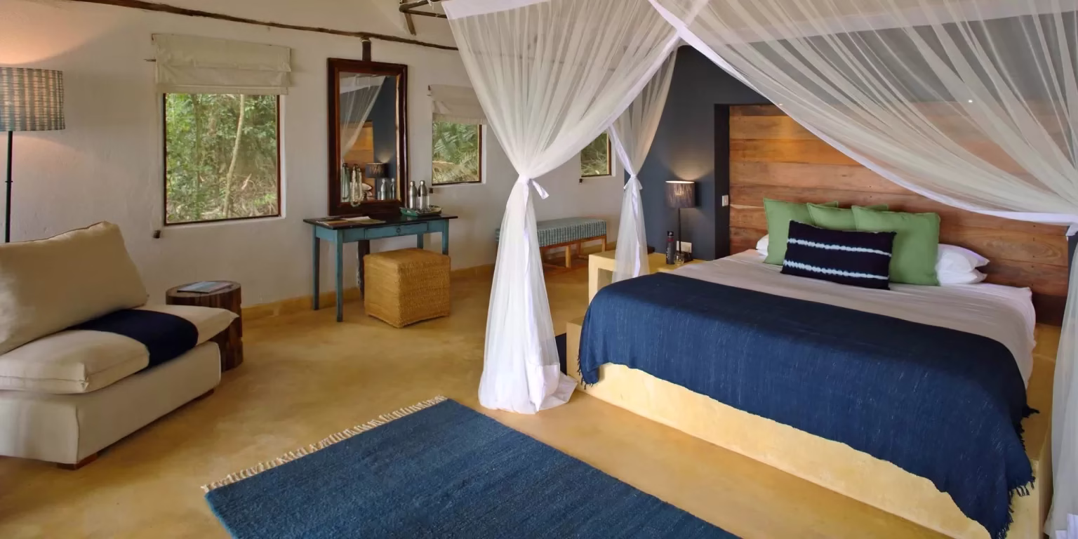 8 waterfront thatched-roof cottages (including 1 four-sleeper family room and a honeymoon suite): Guest Chalet – 2 pax: Rubondo Island Camp features eight large waterfront chalets, surrounded by rolling green lawns that open onto the beachy shores of Lake Victoria. Each chalet has a king-sized bed, enclosed by mosquito nets, and an en-suite bathroom including a flush toilet and running hot water. Shampoo, soap, conditioner, shower and body lotion, and flip-flops for the sandy shores are provided for all guests.