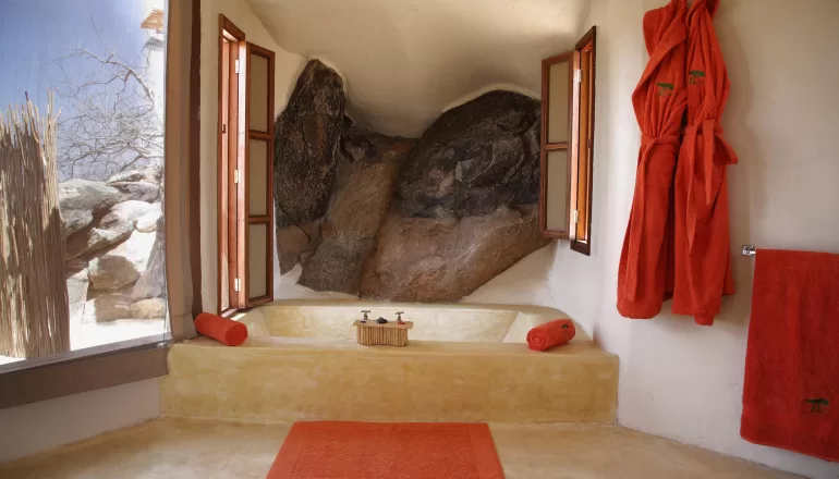 Villa Five is a single villa with one bedroom and a spacious living area and verandah, and is known as Saruni Samburu’s Honeymoon Suite. Villa Five has been written about in numerous publications as the room with the most beautiful view and the most amazing room in Africa. This villa is built onto the edge of a hillside around the natural rock formations, making you feel as if you are on top of the world and still tucked within the beautiful surroundings.