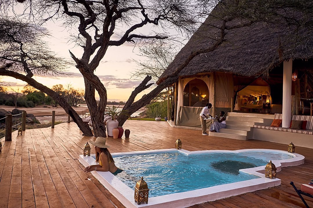 A luxury Camp, each of the nine canvas-sided rooms is over 100m² with private plunge pools and breath-taking views across the Laikipia Plateau toward the jagged peaks of Mount Kenya. The architecture at Sasaab blends Swahili and Moroccan design principals, in which the African heat is of primary consideration. Its position above the river naturally facilitates watching the herds of elephant that come to bathe below as well as a host of other wildlife.