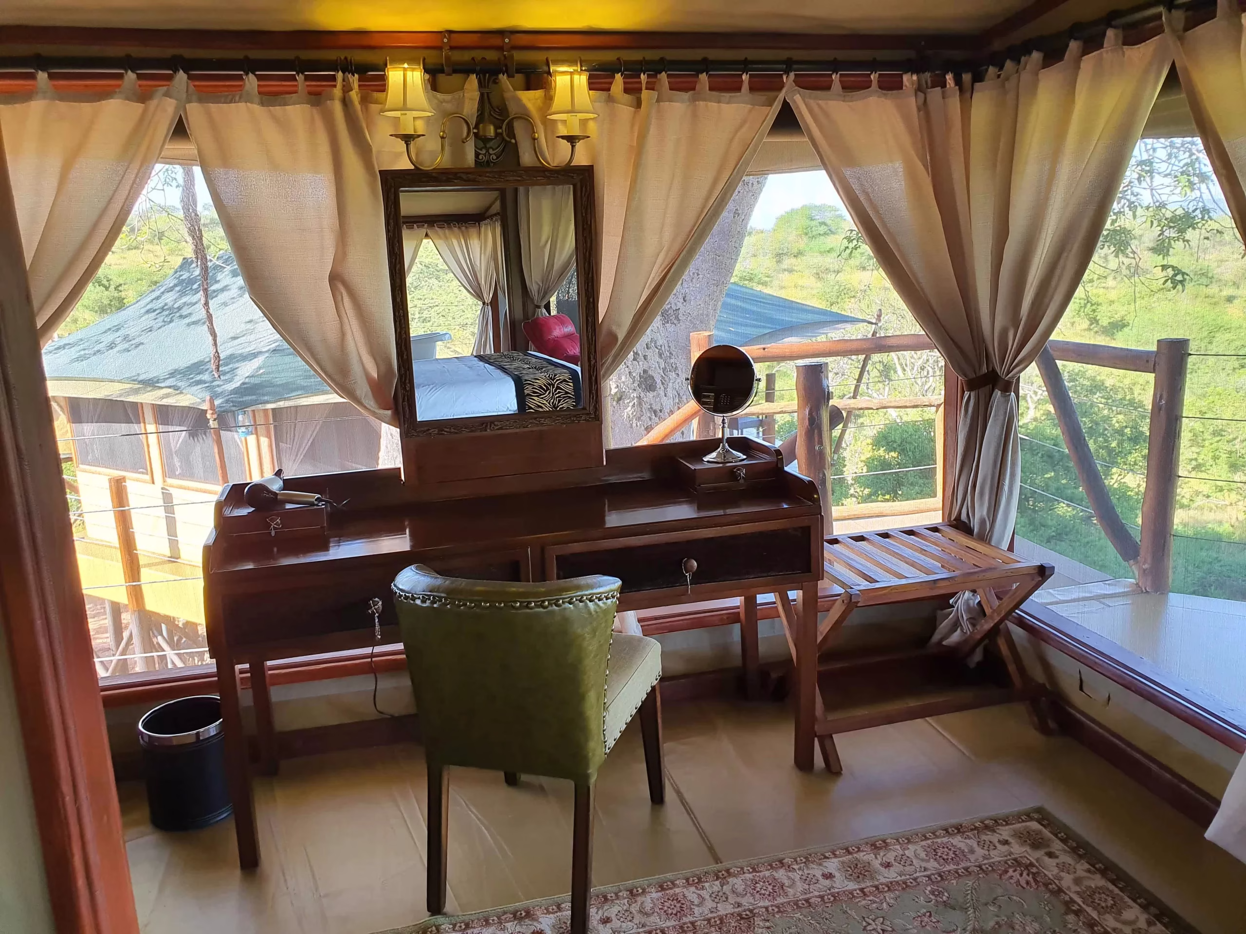 The tents offer luxury beddings, Ultra memory foam beds, outdoor shower, in-room safes, Tea/coffee making facility, hair dryer, 2-way radios, floor standing fans, 24-hour power from inverters, backup power through the generator, rechargeable torch, solar water heater, pressurized running showers, and mosquito repellent.
