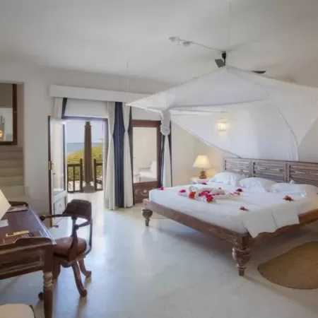 The rooms are spacious with traditionally high beamed ceilings, large windows and terraces offering spectacular views of the beach, garden, swimming pools and the Indian Ocean. Tastefully designed and decorated with tailored fittings, all rooms evoke the East African heritage with doors and furniture hand-carved according to the local Lamu tradition.