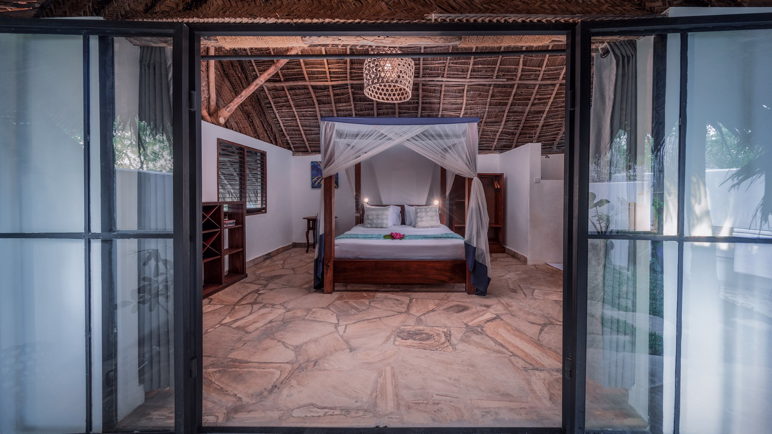 6 Seafront Villas are spacious, airy, and bright, one side has a view of the beach, wooden shutters used at night, a large 4- poster bed draped in the mosquito net, and a coffee table. 3 villas have a large ‘baraza’ styled bed.
