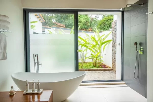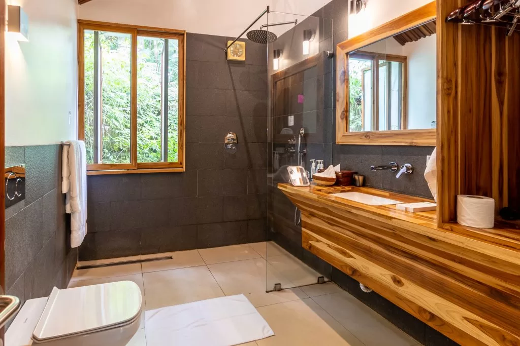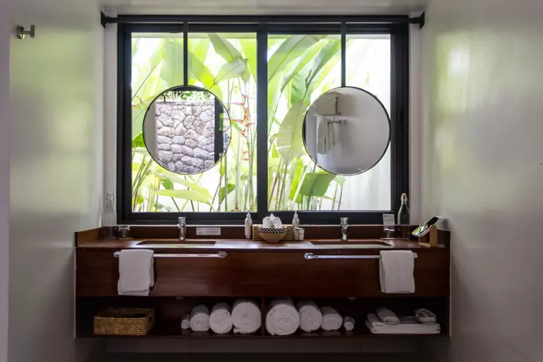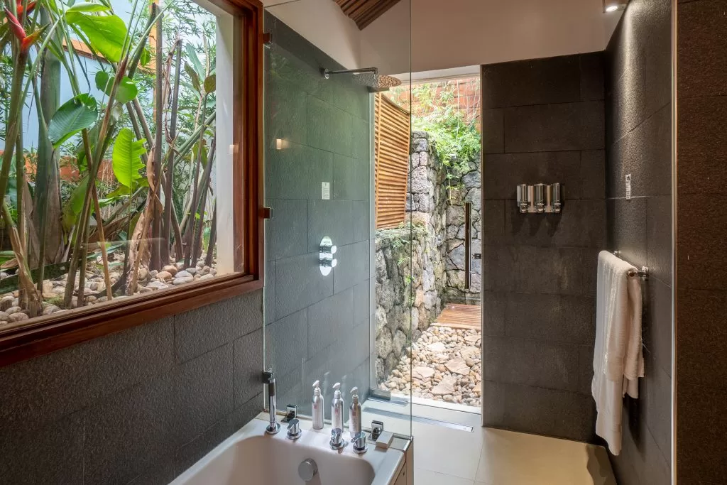 6 Superior King Suite: 2 Superior Suites are adjoining for groups or families; one has a bathtub. 2 Superior Suites can be set up as twin beds, double washbasins with teak vanities, indoor showers and outdoor showers with comfortable seating on the back terrace.