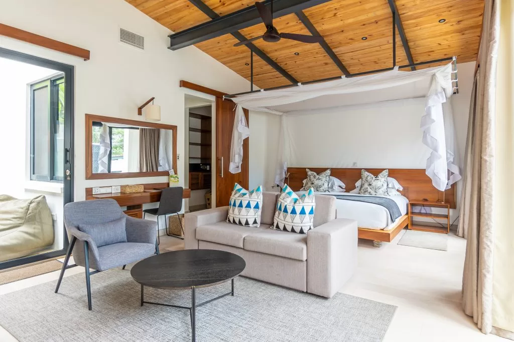 Deluxe King: 3 Deluxe King rooms & 2 Deluxe adjoining for small groups or families, only king bed set up and has wheel chair access, featuring private patios, single wash basin with teak vanities, peaked ceilings and indoor rain showers.