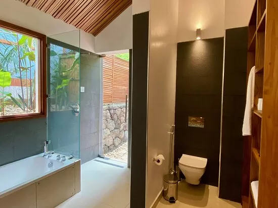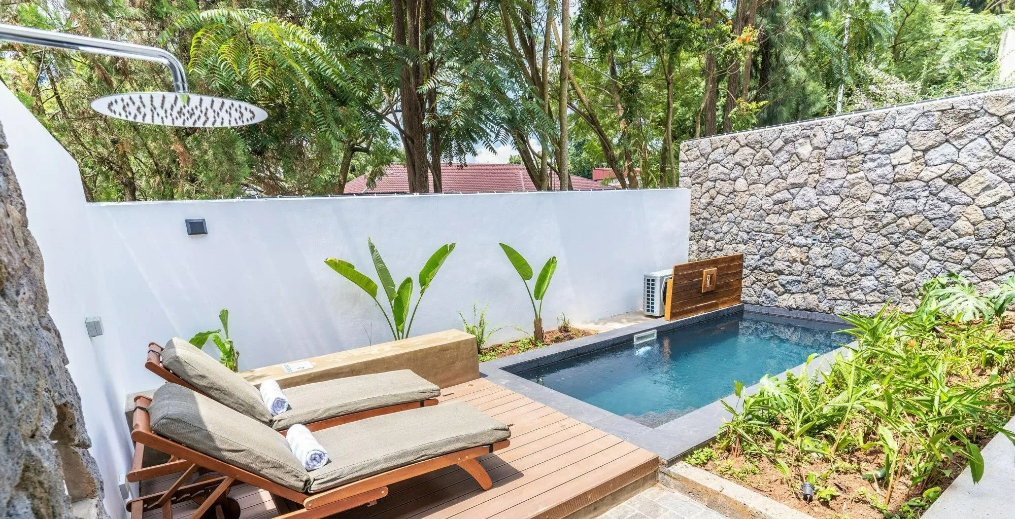 8 Luxury Pool Villa: are most spacious and luxurious rooms, can be set up as king or twin bed with private salt water solar heated plunge pools, private front garden and back, a fully furnished living room, double sink with teak vanities, bath tubs, indoor rain shower and outdoor showers with comfortable seating on the private deck. 2 Villas may be adjoining through a garden gate.